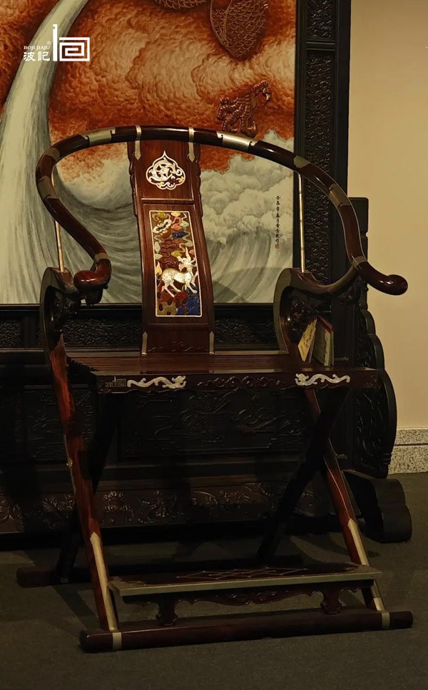 波記家具有一款榮獲“第三屆中山市工藝家具魯班獎?工藝家具”的佳作——《大紅酸枝百寶嵌麒麟交椅》,它承載著深厚的文化底蘊與歷史傳承。