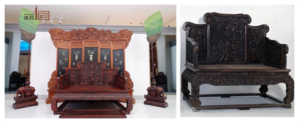 波記紫檀館《雕龍寶座》(圖左)復(fù)刻清代《紫檀木雕云龍紋寶座》(圖右)