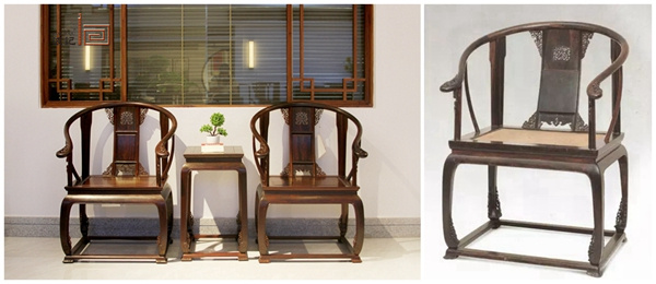 波記紫檀館《皇宮椅》(圖左)復(fù)刻故宮《紫檀透雕卷草紋藤心圈椅》(圖右)